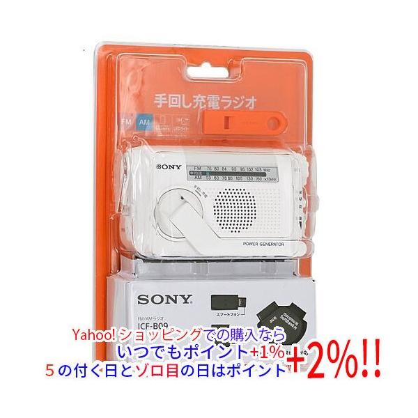 - ソニー ICF-B09 W 手回し充電ラジオ(ホワイト)●普段使いはもちろん、非常時にも便利な3つの特長大口径3.6cmスピーカーを搭載。コンパクトな設計ながら、聴きとりやすい音量でラジオを聴けます。手回し充電、単3形アルカリ乾電池からiPhoneなどのスマートフォン、携帯電話を充電できるので、緊急時にモバイルバッテリーとしても役立ちます。本体前面にLEDスポットライト、上部に周囲を明るく照らすソフトライトを装備。夜間や停電時には懐中電灯として使用できます。※一部のスマートフォン、携帯電話には対応していません。●乾電池がなくてもラジオやライトを使える手回し充電対応本体のハンドルを回転させることで、内蔵の充電池に充電できます。握りやすさやハンドルの回しやすさに配慮したデザインなので、快適に手回し充電ができます。また、単3形アルカリ乾電池(別売)2本でも使用できます。手に入りやすい単3形なので、すぐに使えて便利です。●ワイドFM(FM補完放送)に対応AMラジオの番組をFM放送の周波数で聴けるので、ビルやマンションなどAM放送が入りづらい場所でもクリアな音質でAMラジオ番組を楽しめます。※ワイドFM(FM補完放送)とは、AM(中波)放送局の放送区域において、難聴対策や災害対策のためにFM(超短波)の周波数を用いて、補完的にAM番組を放送することです。 詳細につきましてはメーカーページでご確認ください。※FM補完局にかかわる開始時期、放送局、使用周波数、聴取可能エリアなどは地域によって異なります。詳しくは、各地域のラジオ局ホームページなどをご覧ください。●使いやすさにこだわった操作部回しやすさや見やすさにこだわった大型の選局つまみと表示窓を採用。また、使用中の誤操作を防ぐため、切り替えスイッチ(FM/AM/電源オフ)も大型でしっかりしたつくりになっています。手回し充電用のハンドルは本体に一体化して持ち歩きにも便利なコンパクトサイズです。●キッチンでも使える防滴仕様(JIS IPX4相当)水しぶきや少量の雨から本体を守る防滴仕様なので、キッチンなどの水回りや屋外でも使用できます。【仕様】スピーカー:3.6cm受信周波数:AM 530kHz〜1、710kHz、FM 76.0MHz〜108.0MHz出力:内蔵電源使用時 60mW、アルカリ乾電池(LR6)使用時 90mW電源:乾電池(単3×2)電池持続時間(約):・ライト点灯時:約50時間・FM受信時(スピーカー使用):約80時間・AM受信時(スピーカー使用):約100時間※ソニー単3形アルカリ乾電池(LR6)を使用した場合の目安です。※実際の使用時間は使用環境・状況によって異なります。本体サイズ:(幅)132×(高さ)77×(奥行)58mm質量(電池含む):約376g付属品:キャリングポーチ、マイクロUSBケーブル、充電プラグアダプター、非常用の笛、ハンドストラップ