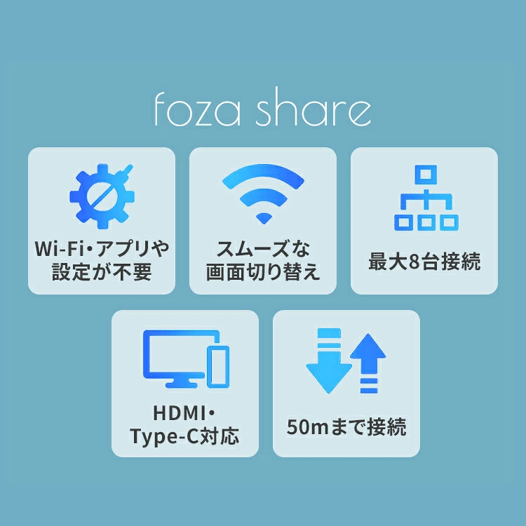 foza share ワイヤレス 画面共有機器 受信機(HDMI)×1個、送信機(USB-C)×2個 FA-001 画面共有 画面切替 ワンタッチ切替 最大8台対応 PC スマホ Wi-Fi不要