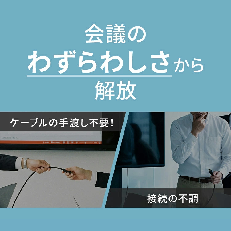 - よくある質問 Q,この製品はどんな用途で使えますか? A,会議やプレゼン、授業、家庭での動画視聴など幅広い用途で使用できます。大画面での共有に最適です。 Q,接続方法は難しいですか? A,Wi-Fi不要で接続可能。Bluetooth不要で、簡単にミラーリングできます。 Q,どの端末に対応していますか? A,スマートフォン、タブレット、PCなど幅広い機種に対応しています。 Q,HDMIとType-Cはどう使い分けますか? A,HDMIはテレビやプロジェクター接続、Type-CはスマホやPCの映像出力に使用します。 Q,画面切替はスムーズですか? A,スムーズに画面を切り替えられる設計で、会議や授業でもストレスなく使用できます。 Q,長時間使用できますか? A,安定した接続で長時間の会議やプレゼンにも対応可能です。 Q,どんなシーンで活躍しますか? A,会社の会議、学校の授業、家庭での動画視聴など様々なシーンで活躍します。 Q,持ち運びはできますか? A,コンパクト設計で持ち運びしやすく、外出先でも利用可能です。 Q,複数人での利用はできますか? A,複数人での画面共有やプレゼンに対応しており、会議効率を高めます。※DP-Altモードに対応したUSB-C/HDMIのPC、スマートフォン、タブレット、カメラなど多様なデバイスで利用できます。