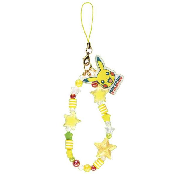 - 星形や丸型など様々な形状のビーズを組み合わせたハンドストラップ。ビーズはポケモンに合わせたカラーです。ポケモンデザインのアクリルチャームつき。