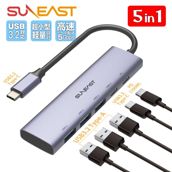 【正規代理店】SUNEAST 5in1 USB Type-C マルチハブ USB3.2 Gen1(TypeA 1ポート / TypeC 3ポート)アルミニウム合金USB PD 100W 給電専用Type-C SE-HUBC51A3C1P