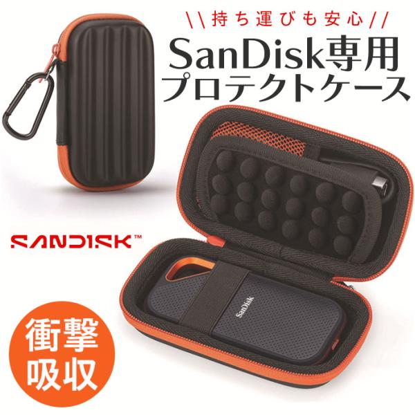 【SanDisk SSD ケース】 保護カバー 耐衝撃 EVA素材 SanDisk Extreme/Extreme PRO 対応 カラビナ付き メッシュポケット 軽量 コンパクト ブラック×オレンジ