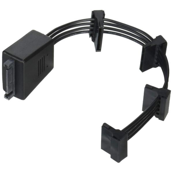 - 4分岐SATA電源ケーブル■全ブラック仕上げの美しいケーブル■4セットのSATAドライブおよび装置への接続をサポート■2200μFコンデンサ2個により安定した+12Vおよび+5V電圧を供給■各SATAコネクタ間隔は43mmで、大部分のケースと互換性あり