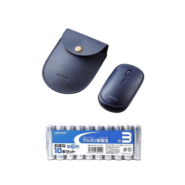 エレコム BlueLEDマウス/薄型/Bluetooth対応/4ボタン/ポーチ付/ブルー + アルカリ乾電池 単3形10本パックセット M-