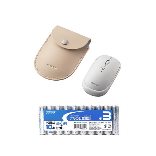 エレコム BlueLEDマウス/薄型/Bluetooth対応/4ボタン/ポーチ付/ホワイト + アルカリ乾電池 単3形10本パックセット M