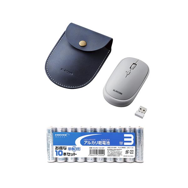 エレコム BlueLEDマウス/薄型/無線/4ボタン/ポーチ付/グレー + アルカリ乾電池 単3形10本パックセット M-TM10DBGY+HDLR6/1.5V10P