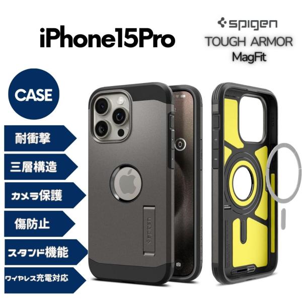 Spigen iPhone15Pro ケース MagSafe 耐衝撃 スタンド付き 米軍MIL規格取得 マグネット搭載 3層構造 カメラ保護 傷防止 衝撃吸収 ワイヤレス充電対応 タフ・アーマー マグフィット ACS06732 (ガンメタル)