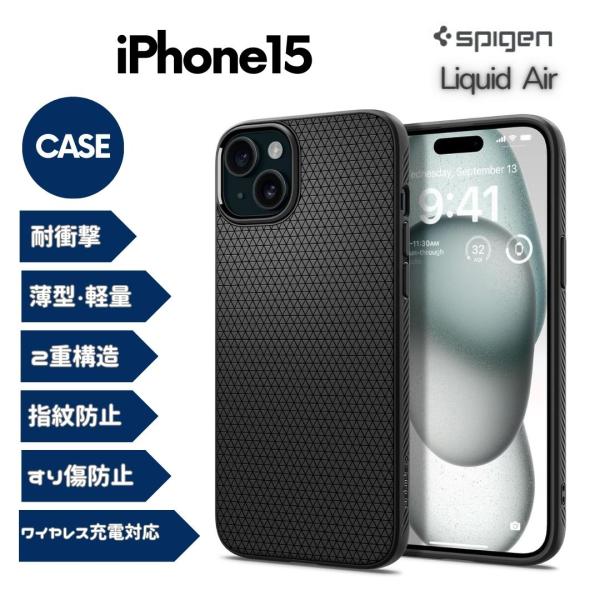 Spigen iPhone15ケース 耐衝撃 薄型 ストラップホール 軽量 さらさら 米軍MIL規格取得 2重構造 レンズ保護 指紋防止 擦り傷防止 マット仕上げ ワイヤレス充電対応 リキッド・エアー ACS06790 (マット・ブラック)