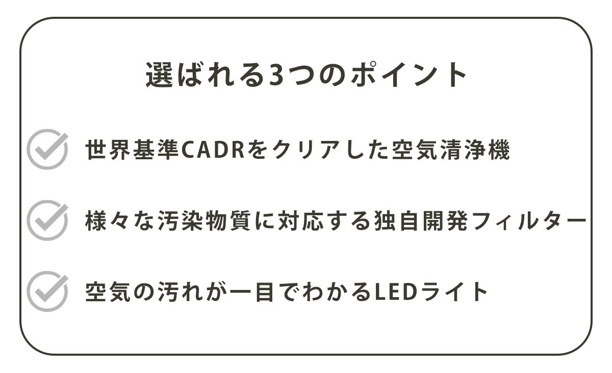 ●世界基準CADRをクリアした約19畳のお部屋の空気を20分でキレイにしてくれる空気清浄機です。