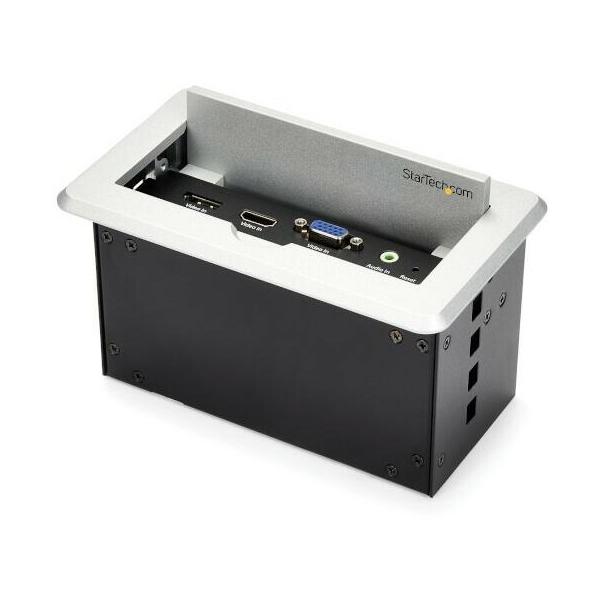 - 商品情報商品の説明AV機器、ネットワーク、USB充電などの接続機能を提供する卓上用AV接続ボックス。会議室、講堂、教室などのテーブルや演題に取り付けて使用します。HDMI/DisplayPort/VGAノートパソコンを会議室の大型HDMIディスプレイに接続し、LANアクセスとUSB機器の充電が簡単にできるソリューションです。テーブルの中に接続ケーブルを隠し、会議室内の配線整理にも一役を買います。 プレゼンテーションに大画面を活用 会議室でプレゼンテーションを行う際、この卓上ボックスを使用してノートパソコンを備え付けの大型ディスプレイやプロジェクタに接続することができます。最大解像度は4K/30Hzに対応しています。ビデオ入力はHDMI、VGA、DisplayPortに対応しており、様々なノートパソコンをサポート可能です。HDMIディスプレイに最後に接続されたタイプを自動的に出力します。 便利なUSB充電機能と有線ネットワーク接続 ボックスには3口のUSB充電ポートがついており、会議室へのビジターがiPhone/iPadなどのスマートフォンやタブレットを充電できるようになっています。さらに、イーサネットパススルーポートもついており、Wi-Fi?が使用できない部屋で安全な有線ネットワークに接続可能です。 洗練されたテクノロジーとスタイル アルミニウム仕上げの会議室用接続ボックスは、どんなスペースにも合うデザインです。使用していないときは目隠しパネルで接続ポートを目立たないようにカバーし、すっきりした外観を保ちます。 本製品には、StarTech.comによる2年間保証と無期限無料技術サポートがついています。主な仕様 単一アクセスポイントからHDMI/VGA/DisplayPort対応ノートパソコンを会議室のHDMIディスプレイに接続 スマートフォンやタブレットの充電に便利なアクセスしやすいUSB充電ポート(x3) テーブルにはめ込むタイプのAV接続ボックスで会議室や講堂に洗練されたスタイルとテクノロジーを追加。使用していない時はポートを隠せるポップアップパネル付き イーサネットパススルーで会議用テーブルに安全な有線ネットワーク機能を提供 自動AV切り替え機能でノートパソコン画面を素早く切り替え
