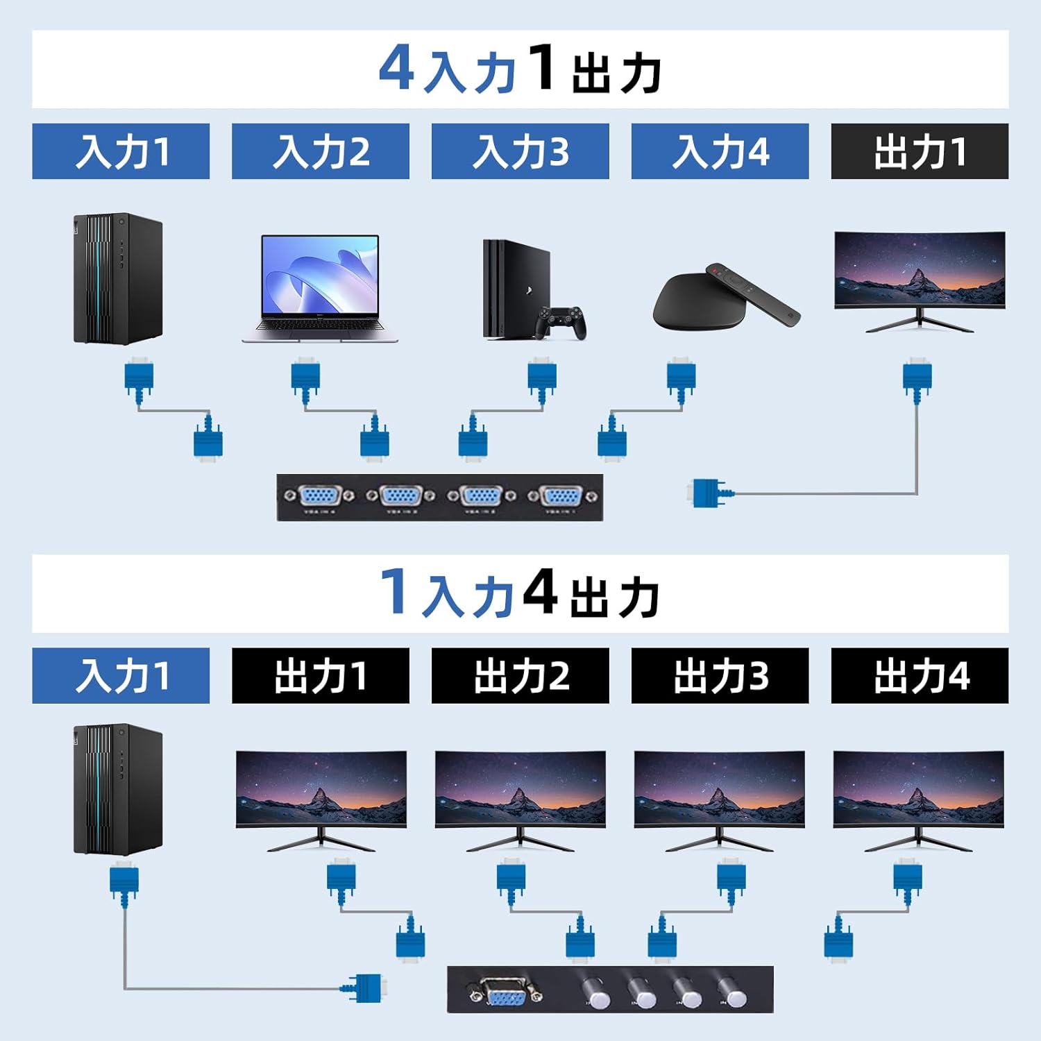 【4入力1出力/1入力4出力 双方向対応】:最大4台のVGA機器(PC、ノートパソコンなど)を1台のモニターに接続、または1台の出力信号を4台のディスプレイに切り替えて表示可能。双方向設計により、さまざまな環境で柔軟に対応します。