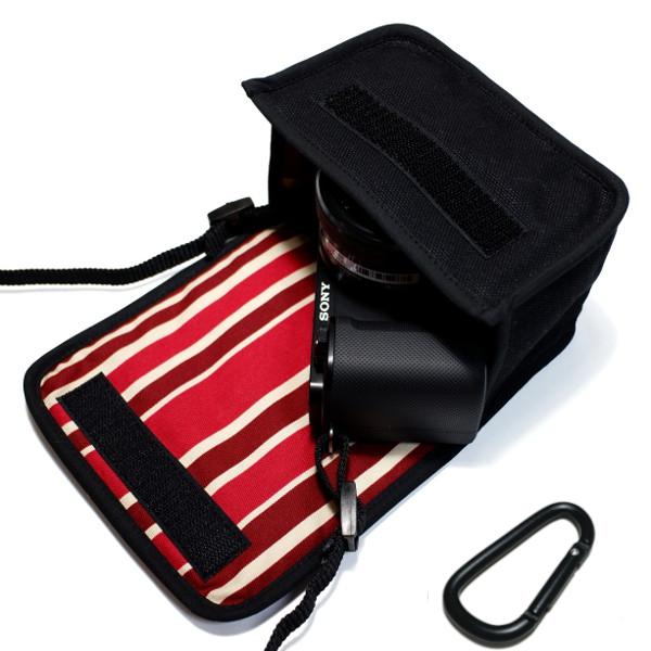 ソニー VLOGCAM ZV-E10ケース カラビナ付(ブラック・ボルドーストライプ)パワーズームレンズキット suono ハンドメイド