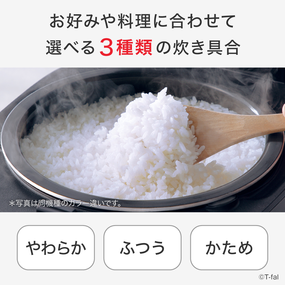 - 商品詳細 T-fal ザ・ライス 遠赤外線IH炊飯器エッセンシャル 5.5合 SPEC ●本体サイズ:約 幅25.7×奥行き32.3×高さ23.2cm(ふたを開けた時の高さ46.5cm)、コードの長さ1m、 ●容量:5.5合(1.0L) ●セット内容:本体、炊飯用カップ、スタンディングしゃもじ、取扱説明書兼保証書 ●本体重量:約5.0kg ●素材・材質: 【本体・ふた・蒸気口】ポリプロピレン 【パネル】ポリカーボネート+ABS 【内ぶた】ガラス+ポリプロピレン+シリコン 【釜】アルミニウム+鉄 【電源コード】クロロスホン化ポリエチレンゴム 【炊飯用カップ・スタンディングしゃもじ】ポリプロピレン ●電圧:100V、消費電力:1190W、周波数:50-60Hz ●炊飯プログラム:8モード(白米・無洗米・玄米・雑穀米・長粒米・炊き込み・冷凍ごはん・お粥) ●炊飯できる米:白米・無洗米・玄米・雑穀米・長粒米(ジャスミンライス等) ●炊き具合:3種類(やわらか・ふつう・かため)※白米・無洗米のみ ●保証期間:1年、釜内面コーティングは3年保証 ●生産国:中国 ●箱サイズ:約 幅42.2×奥行33.6×高さ26.642.2cm ●JANコード:3045387253509 3045387253486 3045387253493 機能説明 T-fal(ティファール)について 1956年にフランス・パリの郊外の町で誕生し、世界で初めて「こびりつきにくい」(=ふっ素樹脂加工)フライパンを発明したティファール(株式会社グループセブ ジャパン)。伝統と革新を併せ持ち、世界約150ヵ国で愛されています。 "毎日の家事をもっと楽しく、もっとラクに!"人気商品「取手の取れるフライパン」や、すぐにお湯が沸かせる定番の電気ケトルなどロングセラー商品をはじめ、簡単においしい料理がつくれる使いやすい圧力鍋や電化製品・調理器具を取り揃えています。取っ手のとれるシリーズでは、フライパンやお鍋を狭いスペースでもスマートに収納できるうえ、冷蔵庫やオーブンにそのまま入れられるのも便利です。シンプルでスタイリッシュなデザインも魅力。 ティファールで快適なキッチンライフを!毎日使える調理器具は、ご自宅用だけでなく、新生活を始めるご家族・ご友人へのプレゼントとして、引っ越し祝い・結婚祝いのギフトにもおすすめです。商品情報 ティファール独自技術「遠赤外線 x 高火力IH」を搭載した「ザ・ライス」シリーズ おしゃれなマット質感、日常使いに便利なエッセンシャルモデル。 いつものお米をもっと美味しく。 【ティファール独自!遠赤外線×高火力IH】 ・ふたからの遠赤外線が、一粒一粒のお米の芯まで一気に炊き上げ、粒立ちがよく、ハリ・甘みのあるご飯に。 ・高火力IH層、釜を下部からしっかりと包み込み、熱の対流をおこしながら、一粒一粒を均一に素早く炊き上げます。 【独自球状の本釜】 厚さ2mmの本釜は、発熱効率と熱伝導に優れた材質を採用し、釜内の熱を素早く均一に伝えます。 【8種類の炊飯プログラムで最適な炊き上がりを実現】 白米/無洗米/玄米/雑穀米/長粒米/炊き込み/冷凍ごはん/お粥 【選べる3つの炊き具合】 合計3種の炊き具合が選べます。 「やわらか」「ふつう」「かため」 ※白米・無洗米のみ 【炊き立てのようなおいしいさ「冷凍ごはん」モード】 ・「冷凍ごはん」モードなら、再加熱しても、お米の水分が抜けにくいのでパサつかず、炊き立てのようなおいしさになります。 ・その秘密は炊き方。最後の炊飯工程で、炊き上がり時間を絶妙に調整し、お米の水分を蒸発しにくくしているため、弾力があり粒立ちの良いお米が炊きあがります。 【お手入れ簡単】 ・トップパネルはフルフラット、フレームもフラットで、汚れがさっと拭き取りやすい。 ・洗うのは内ぶた、釜、蒸気口の3点だけ。 ・内ぶた、蒸気口、付属の炊飯用カップとしゃもじは食洗機対応だから洗浄も楽々。 ・洗浄機能も搭載で、炊き込みごはんを炊いた後などの匂い残りをおさえます。 SERIES 人気のカテゴリから探す T-falのすべての商品を見る
