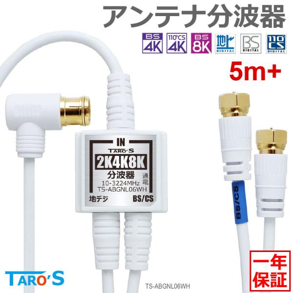 アンテナ分波器 4K8K放送 ケーブル付き ケーブル一体型 アンテナケーブル 20cm×2 + 5M BS CS 地デジ CATV対応 2.5C 金メッキ ホワイト TS-ABGNL06WH TARO'S
