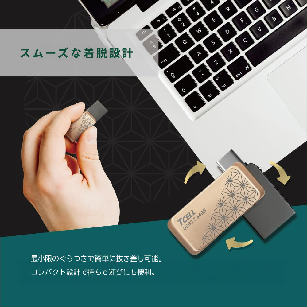 【iPhone/スマホ容量増に】 TCELL USBメモリ 256GB 小型 大正ロマン Type-A Type-C 両コネクタ対応 超高速読み込み USB3.2 亜鉛合金製 360度回転式 2in1 usb