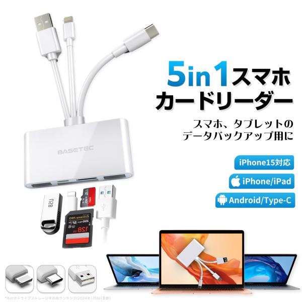 SDカードリーダー BASETEC 5in1マルチカードリーダー SD カードリーダー iPhone カメラリーダー スマホカードリーダー