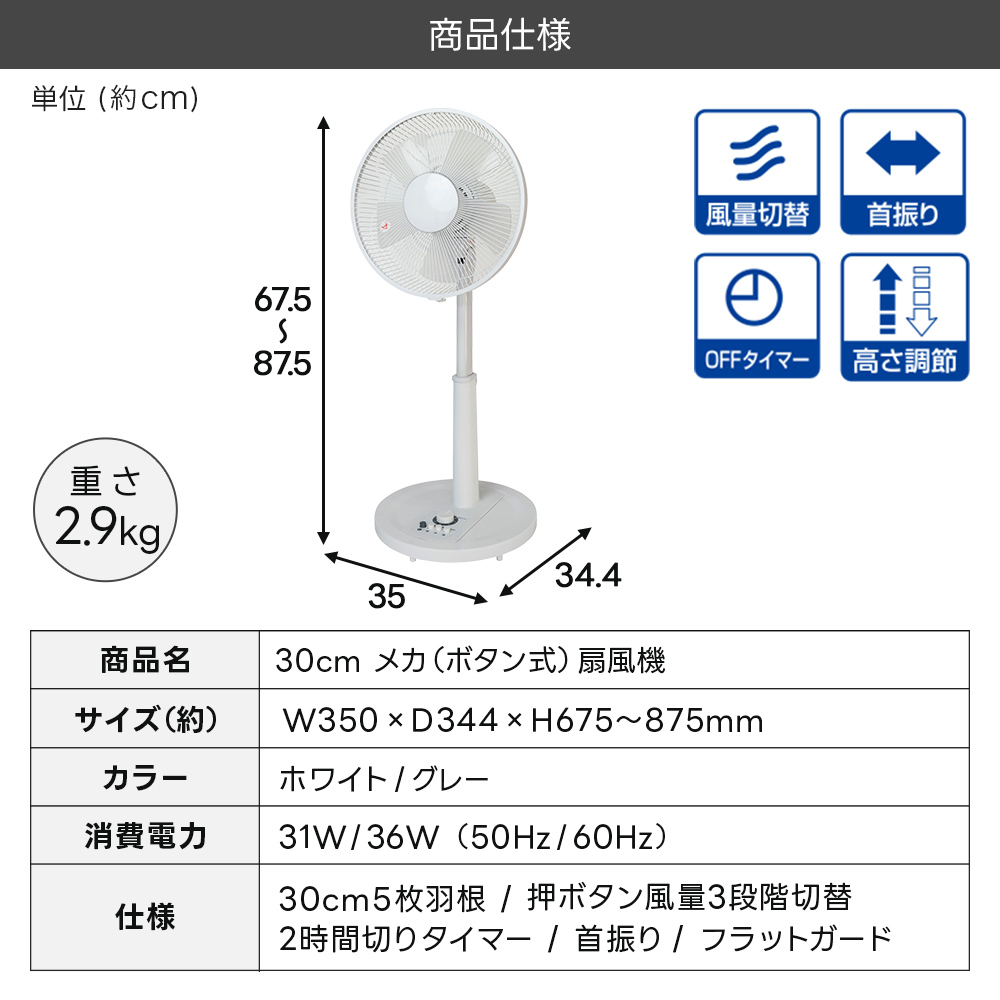 - 商品名30cm リビング メカ(ボタン式)扇風機 型番KI-1710(W)(ホワイト) / KI-1710(G)(グレー) モーターACモーター 操作方式メカ式(押しボタン風量切替+タイマーつまみ) ※リモコンなし 羽根30cm・5枚羽根(PP樹脂) 風量切替押ボタン3段階切替 首振り左右首振り タイマー2時間切りタイマー 消費電力31W/36W(50Hz/60Hz) 本体サイズ(約)W350xD344xH675~875mm 重量(約)2.9kg カラーホワイト / グレー 【検索ワード】メカ式 扇風機 リビング ホワイト シンプル 押しボタン 首振り 節電 ACモーター テクノス タイマー 新生活 一人暮らし リモコンなし 操作簡単 コンパクト KI-1710W KI-1710G