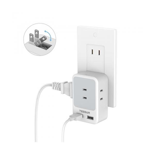 【12/1までP2倍】TESSAN テッサン 電源タップ USB コンセントタップ 雷ガード付 3個AC口 2つUSBポート 分岐 充電 スイングプラグ TS-723-GR-JP〈TS723GRJP〉
