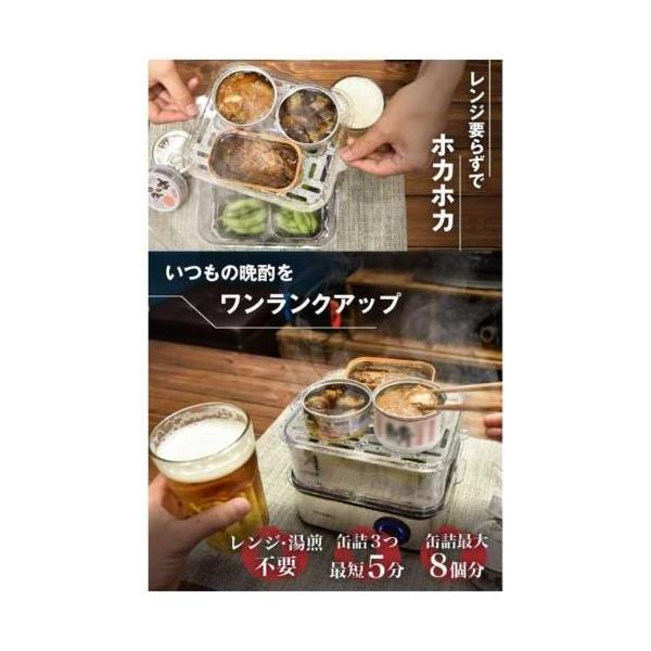 - ■レンジ・湯煎不要で缶詰もホカホカ食べごろ!出来立てのようなおつまみで晩酌をワンランクアップ 晩酌にピッタリな美味しいおつまみ缶詰、最近種類も増えてきましたよね。そのままでももちろん手軽に美味しいおつまみを楽しめるのですが、温めると出来立てのような熱々になり、とっても美味しいんです!いつもの晩酌が、ワンランクアップしちゃいます。■温めるのには少し面倒な缶詰 温めると出来立てのようで何倍も美味しくなるおつまみ缶詰。でも、電子レンジは使えないし、湯煎するのも面倒。お皿に移すと洗い物が増えるし…缶のままホカホカにできると便利だと思いませんか?このスチーマーを使えば、レンジも湯煎も不要で缶詰がホカホカの食べごろに!冷めてきても温め直しも簡単なので、いつもの晩酌が簡単にワンランクアップすること間違いなし!■蒸し器としても有能 缶詰を手軽に温められるこちらの商品ですがあらかじめ入れた水を熱して中のものを温めるので、温めるだけじゃなく蒸し料理にも最適なんです。