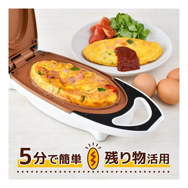 - サイズ(折りたたみ時) 幅130×奥行325×高さ95(mm) 重量 約1.4kg 電源 AC100V 50/60Hz 消費電力 800W 安全装置 サーモスタット、温度ヒューズ ケーブル長 約1.2m 材質 本体:フェノール樹脂 プレート:アルミニウム(塗装:フッ素樹脂加工) 内容品 本体、日本語取扱説明書 注意事項 ※記載されている物以外は付属いたしません。 パッケージサイズ 幅370×奥行104×高さ146(mm) パッケージ込み重量 約1.5g 保証期間 購入日より12カ月 発売日 2023/09/11 ※仕様は改善のため予告無く変更する場合があります。◆残り物が5分でご馳走オムレツに大変身! 残り物が5分でご馳走オムレツに大変身! とっても簡単に綺麗なオムレツが誰にでも作れます。 いつものもう一品、忙しい朝の食事にもぴったりです。 ◆余った惣菜、使いかけの食材がオムレツに 中途半端に余らせたおかずやお惣菜、調理で余った使いかけの食材… これらを卵に包めば和風・洋風オムレツに変身! 具材を入れて包むのが苦手でも、これがあれば誰でも簡単に具材入りのオムレツを作れます! ◆簡単・綺麗に仕上がるヒケツ 両面ヒーターなので火の通りが早く、オムレツであれば約5分で完成! フッ素樹脂加工でこびりつかず、するんと剥がれるので綺麗なオムレツが仕上がります。 1度に調理できるのは卵2つ分。 もう1品!にぴったりなオムレツがあっという間に出来上がります。 ◆誰にでもできる簡単調理 予熱したオムレツメーカーに、卵と具材を流し入れプレートを閉じるだけ。 必要に応じてひっくり返したらたった5分でとても綺麗なオムレツが完成します! 難しい操作や、火加減の調整は一切ナシ。 誰にでも手軽にオムレツが作れるのは嬉しいポイント。 ◆ハンバーグやホットケーキなどにも 使えるのはオムレツだけじゃない! 両面ヒーターで火の通りが早いので、ハンバーグやホットケーキ作りにもぴったり。 また、ヒーター部分は型になっているので包むのが難しいとんぺい焼きや、形成の難しいハッシュポテトなどの調理にも適しています。 ◆お手入れ簡単、収納しやすい お手入れは拭き取るだけ! フッ素加工のプレートは焦げ付きにくいのでお手入れラクラクです。 また、スリムで立て置きできるので収納場所にも困りません。 ◆スタッフボイス 実際に使ってみたリアルレビュー! サイズ詳細 ☝ページトップ