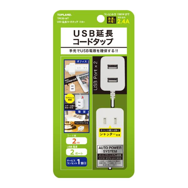 トップランド USB延長コードタップ 2.0m TPE20-WT