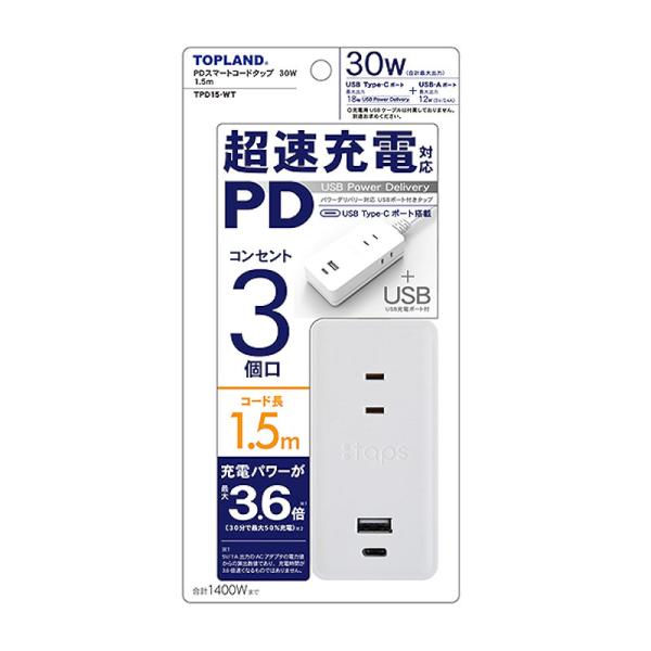 トップランド PD対応 USB充電ポート付 コードタップ 30W 1.5m ホワイト TPD15ーWT