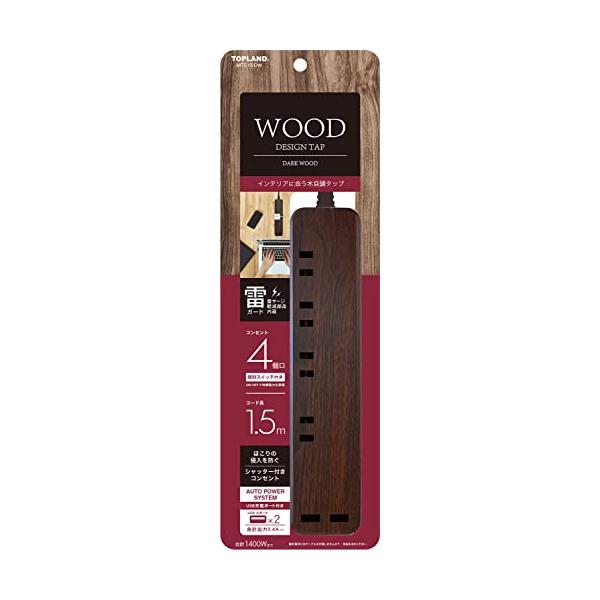 トップランド 電源タップ 雷ガード 個別スイッチ付 (コンセント4個口 / 2USBポート) シャッター付きコンセント コード長1.5m オートパワー