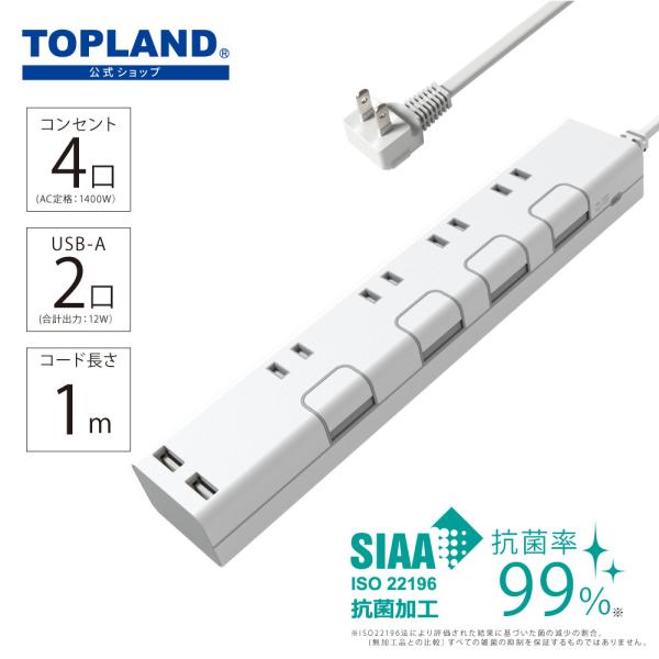 電源タップ USB コンセント タップ 延長コード 個別スイッチ 節電 スイッチ 雷ガード 1m 4個口 ホワイト STPC100-WT トップランド 公式ショップ