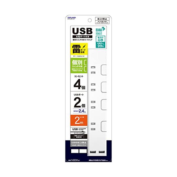 TOPLAND(トップランド) USB 電源タップ AC4個口 USBポート2個口 延長コード 2m 雷ガード 個別スイッチ ほこり防止シャッタ
