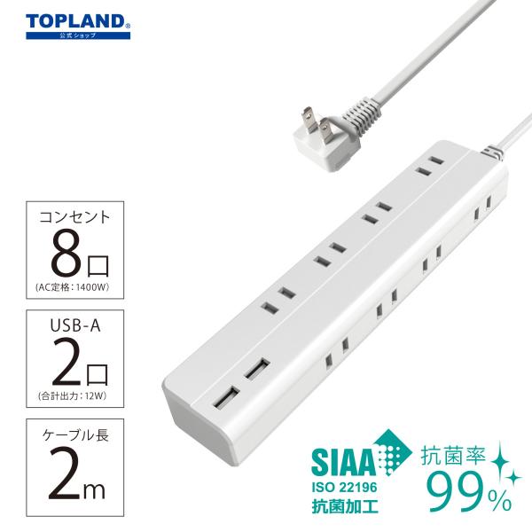 電源タップ USB コンセント タップ 延長コード 2m 8個口 ホワイト STPA820-WT トップランド 公式ショップ