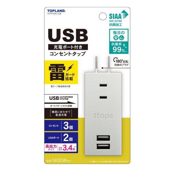 - トップランド TOPLAND USB付き電源タップ 雷ガード付き スイングプラグ 抗菌仕様 3個口タップ 最大出力3.4A仕様 STPP500-GR 本体サイズ 幅4×奥行3.1×高さ9cm 重量85g 材質 ABS、PC 商品説明 ●コンセントとUSBの複合電源タップです●コンセント3口、USB-Aポート2個を搭載●直差しタイプ●コンパクトサイズ●SIAA抗菌加工●持ち運びしやすい折り畳みプラグ●合計出力3.4A●機器に合わせて最適な充電ができます●雷ガード付き 商品補足説明 YAMAZEN ヤマゼン 山善 通販 コンセントタップ 電源タップ 電源 OAタップ USB充電 充電ポート オートパワーシステム AUTOPOWERSYSTEM スマートフォン スマホ 端末 トラッキング防止 コード たこ足 タコ足 3口タップ 3個口タップ 2個口ポート AC100V(50/60Hz) 0.4A 1400W DC5V/3.4A 充電器 STPP500-GR R0V41 R0V41生活家電 ランキング