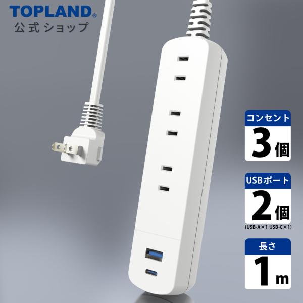 延長コード ACコンセント3個口 USBポート (Cタイプ×1個 Aタイプ×1個) PD パワーデリバリー 1m 電源タップ ホワイト TPD10-WT トップランド 公式ショップ