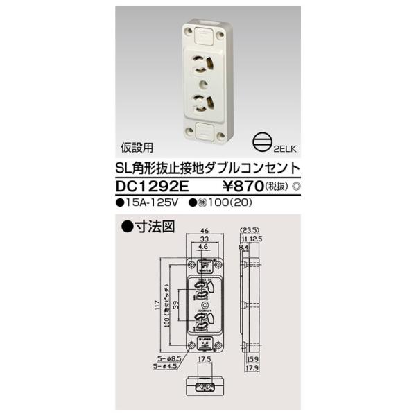 - 形名:DC1292E 品名:SL角形アース付抜止ダブルコンセント 品種名:シーリング/防水/フロア他 商品コード:74512921 JAN:4974550026345