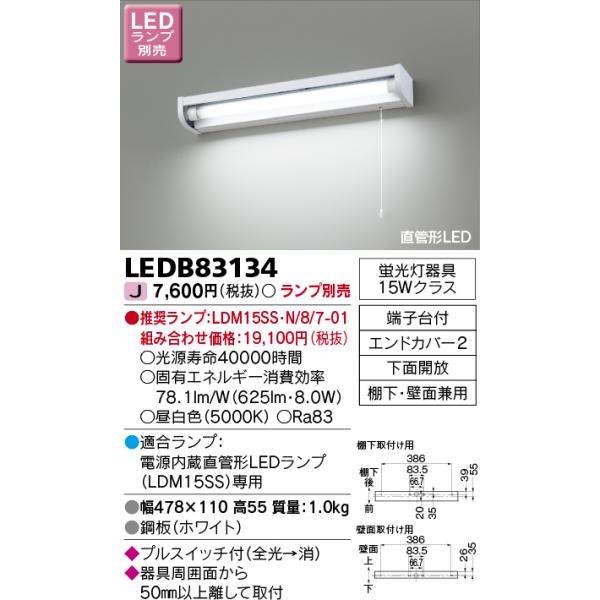 - *ランプは別売となります 基本情報 形名 LEDB83134 品種名 LED流し元灯 商品コード 12800178 JANコード 4974550477376 発売日 2014/04/15 詳細商品情報 特記事項 ランプ別売 特記事項 LED直管ランプ(LDM15SS) OB055173X OB055124 DBK15611 OB055180