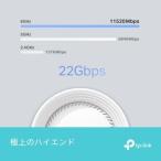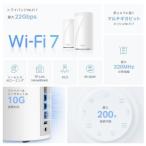 - 【レビュー特典付き】 特典期間:2026年4月30日(木)まで フォーム応募期間:2026年5月7日まで 参加の流れ: STEP1 こちらのページから商品購入 STEP2 使用後の感想自由にご評価 STEP3 応募フォームから応募(画像のリンク/QRコードにより応募、忘れないでください) STEP4 屋内見守りカメラTapo C202プレゼントGET! 賞品の発送:2026年5月以降順次発送 注意: 表記の速度は320MHz(6GHz)と240MHz(5GHz)の帯域幅を使用した場合の値で、2024年3月時点では日本国内で5GHz帯の240MHz帯域幅は使用できません。 320MHz非対応ファームウェアを利用した場合の速度は5760Mbps(6GHz)+ 5760Mbps(5GHz)+ 1376Mbps(2.4GHz)となります。 320MHz対応のファームウェアを利用した場合の速度は11520Mbps(6GHz)+ 5760Mbps(5GHz)+ 1376Mbps(2.4GHz)となります。 [12ストリーム 22GbpsトライバンドWiFi]:11520Mbps(6GHz)+ 8640Mbps(5GHz)+ 1376Mbps(2.4GHz) [10Gbps対応]:2つの10Gbps対応WAN/LANポート(ファイバー+イーサネット)と、2つの2.5Gbpsポートを備え、高速スループットを維持します。 [WiFi/有線バックホールに対応]:各Decoユニットの接続はWiFiはもちろんLANケーブルどちらでも可能なので、ネットワーク全体のスループットの向上や遅延をさらに改善したい場合は、信頼性の高い有線バックホールをご利用ください。 [MLO (Multi-Link Operation)]:複数のバンド・チャンネルと同時にデータの送受信が可能になり、スループットの向上・遅延の改善・信頼性がさらに向上しました。 [320MHzチャンネル]:帯域幅が倍増し、データも転送速度がさらに向上しました。 [6GHzに対応]:新しく解放されたバンドを利用するため電波干渉の可能性が低く、高速で信頼性の高いWiFi接続が可能です。 [TP-Link HomeShield]:保護者による制限機能や、リアルタイムのIoT機器の保護といった包括的なネットワークセキュリティソフトを内蔵します。 [後方互換対応]:WiFi 6以前の規格にしか対応していない機器との接続ももちろん可能で、様々なプロバイダーに対応しています。