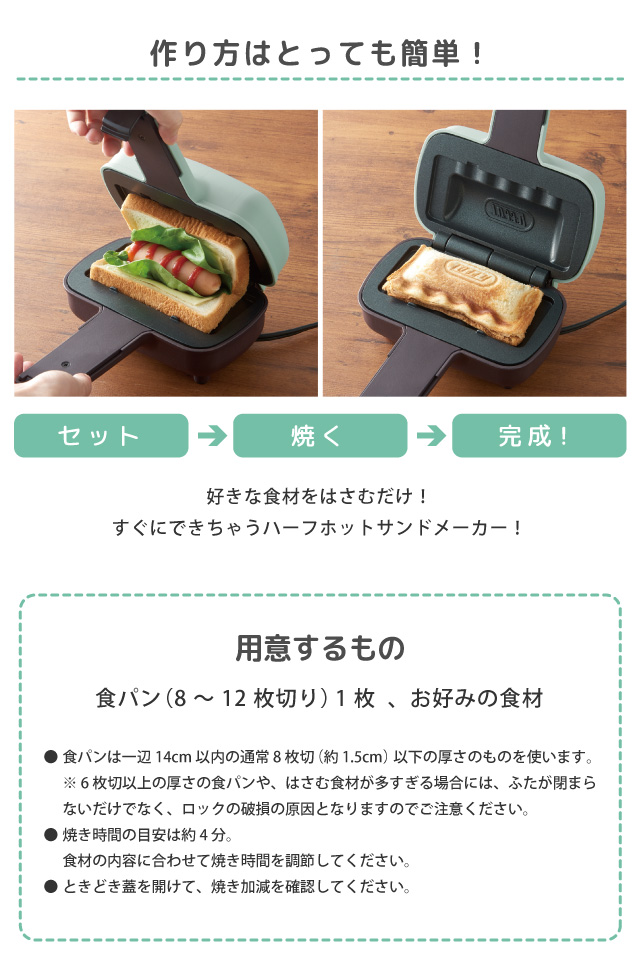 - ちょうど良い食べきりサイズのホットサンドがカンタンに!1枚の食パンを折りたたんで作る“ハーフサンド”ができる電気ホットサンドメーカー。■好きな食材をはさむだけ! 女性やお子様にもピッタリ!1枚で作るから、カロリー控えめの食べきりサイズ!■スッキリ収納 レトロかわいいデザイン。立てて置けるから、収納性もバツグン!■対応食パンサイズ 8〜12枚切り・本体サイズ:約幅167×奥行220×高さ96mm・重量:約750g・消費電力:500W・電源コード長:約0.7m・付属品:ユーザーズガイド ※本商品が対象となるクーポンは、その期間終了後、同一内容でのクーポンが継続発行される場合がございます。