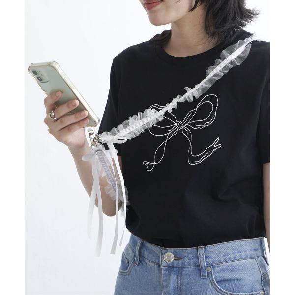 フリル&リボンがコーデのポイントになるスマホストラップ。