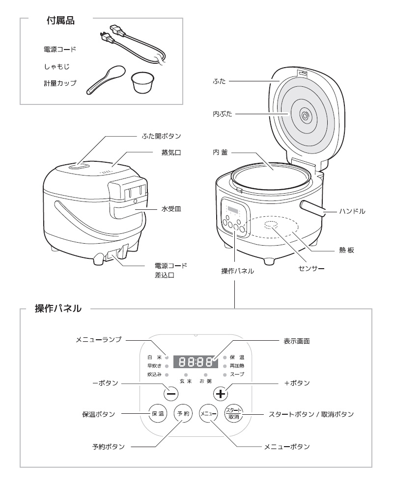 - ベルソス 取っ手付き 3合炊飯器 ホワイト VS-KE23-WH ブラック VS-KE23-BK 電気炊飯器 マイコン式 3合炊き コンパクト 小型炊飯器 マイコン炊飯器 自動保温 予約機能搭載 簡単操作 デジタル表示 一人暮らし おすすめのポイント コンパクトな食べきりサイズの炊飯器。 わかりやすいパネルとボタンで簡単操作! 内蓋は取り外して水洗い可能。 持ち運びや収納に便利な取っ手付き。 部屋になじみやすいシンプルなデザイン。 いつでもお米がふっくらいおいしく炊き上がる!コンパクトな3合炊飯器 製品画像 各部の名称・付属品 製品仕様 ※この商品説明の中の画像はイメージです。 撮影環境やモニターによって、実際の色や質感と異なる場合があります。 ※商品の在庫は、メーカー在庫を共有しておりますため、 在庫更新のタイミングによっては在庫切れが発生する場合がございます。 その場合入荷をお待ちいただくか、 誠に勝手ながらご注文をキャンセルさせていただきます。何卒ご了承くださいませ。