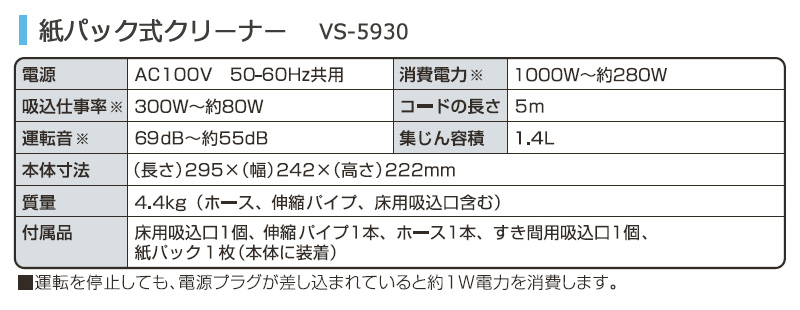 - ■ VERSOS(ベルソス) ■◆ 主な特長 ◆●紙パック式のクリーナー。ゴミがたまったら紙パックをポイっと捨てるだけ。手を汚さず簡単にゴミ捨てができます。たまった汚いゴミ、虫の死骸などを目にすることもないので安心♪●紙パックは市販の各社共通タイプが使用できます。●手元スイッチは強・中・弱・切の操作が可能。●スタンド収納ができるので使わないときは場所を取らずコンパクトにしまっておけます。◆ 主な仕様 ◆■サイズ:(約)長295×幅242×高222mm 約4.4kg(ホース、伸縮パイプ、床用吸込口含む)■電源:AC100V 50 60Hz■消費電力:1000W〜約280W■吸込仕事率:300〜約80W■コード長さ:約5m■運転音:69dB〜約55dB■集じん容積:1.4L■付属品:床用吸込口、伸縮パイプ、ホース、すき間用吸込口、紙パック1枚(本体に装着)、取扱説明書(保証書)※本製品は一般家庭用です。※使用する紙パックについて。「各社共通タイプ」と書かれている市販の掃除機用紙パックをお買い求めください。簡易商品仕様シリーズ名:-ブランド名:VERSOS|ベルソスメーカー型番:VS-5930代表カラー:ブルーカラー:ホワイト×ブルー集塵方式:紙パック掃除機タイプ:キャニスター型本体重量:4.4kgブランド名(カナ):ベルソス