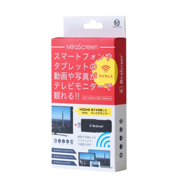- 【製品の特長】 ●スマホやタブレットの画面が大画面で見える! ●ワイヤレスレシーバー Mira Sdreen ●テレビやモニターに「ミラスクリーン」を接続し簡単な設定をするだけ! ●動画、写真、音楽、ゲーム、webサイトを観たり、プレゼンなどのビジネスシーンでもご使用いただけます。 ●microUSB⇔USBケーブルで電源供給をするので電池不要です。 【商品仕様】 商品名 :ミラスクリーン 品番 :V-MCS01 アクセス方式:Wi-Fi Direct/Access Point 無線ALAN :IEEE 802.11b/g/n 周波数 :2.4GHz 映像音声出力:HDMI(Aタイプ)出力 電源 :5V/1A microUSB⇔USB 本体サイズ :W91×H31.5×D13mm 梱包内容 :ミラスクリーン本体、電源ケーブル、HDMI補助ケーブル、保証書兼取扱説明書 ▲ご購入の前にご確認ください。 ※本製品は、AirPlay、Miracast、DLNAに対応した各種スマートフォン(iPhone/Andrond)・各種タブレット・各種パソコン(Mac・windows)にてご使用いただけます。ご購入の前に必ず対応情報をご確認ください。 ※ご使用になられるデバイスのバージョンやアプリの種類により、動画や静止画が観れない場合があります。あらかじめご了承ください。 【注意事項】 ※Amazonプライム・Hulu・Netflixには、テレビ視聴に関する制限(著作権等)がかけられている為、視聴はできません。 ※YouTubeの視聴は可能です。 ※使用する為には電源となるUSB端子が必要になります。 【対応機種】 ・iPhone 全機種 使用可能 ・エクスペリア、ギャラクシー、ファーウェイ、をご利用のお客様も使用可能です。 ただし、発売時期の古い一部機種によっては動作しない場合があります。 ・格安スマホの一部機種では動作しない場合がございます。 格安スマホでは、本体の機能を一部除外している物が多いため動作に支障が出る場合がございます。 ・すべての機種での動作検証は出来かねます。予めご了承くださいませ。