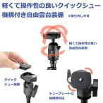 ・雲台には軽くて操作性の良い自由雲台(ボールヘッド)を採用。カメラの着脱がワンタッチで可能なクイックシュー機構搭載。