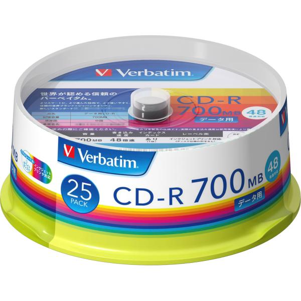 - [Verbatim データ用CD-R 700MB 48倍速 インクジェットプリンタ対応 スピンドルケース 25枚入り SR80FP25V1] の商品説明対応インクジェットプリンタでレーベル印刷可能。ワイド印刷エリア対応。[Verbatim データ用CD-R 700MB 48倍速 インクジェットプリンタ対応 スピンドルケース 25枚入り SR80FP25V1]のスペック●用途:データ用●入り枚数:25枚●記憶メディア容量:700MB●タイプ:CD-R●記録回数:1回のみ●対応倍速数:48倍速●印刷範囲:23mm-118mm●ケース:スピンドルケース●製品寸法:直径14.2×H5.5cm●製品質量:525g○返品不可対象商品