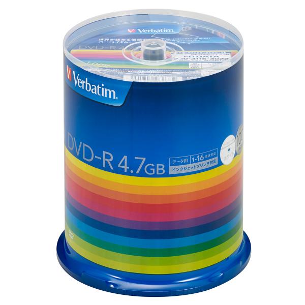 - [Verbatim データ用DVD-R 4.7GB 1-16倍速対応 インクジェットプリンタ対応 100枚入り DHR47JP100V3] の商品説明●対応インクジェットプリンタでレーベル印刷可能。[Verbatim データ用DVD-R 4.7GB 1-16倍速対応 インクジェットプリンタ対応 100枚入り DHR47JP100V3]のスペック●用途:データ用●記憶メディア容量:4.7GB●対応倍速数:1-16倍速●入数:100枚(スピンドルケース)○返品不可対象商品