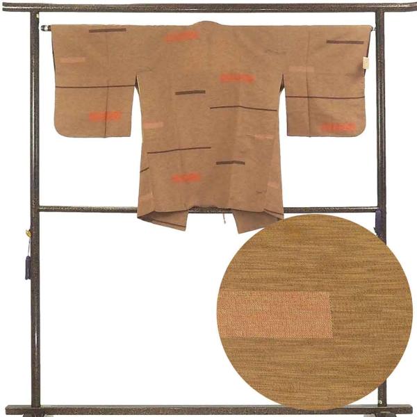 正絹の袷道行コートです。茶色地に横段柄でカジュアル用途にお召しいただけます。裄の縫い代は2.5cm程度ありそうです。