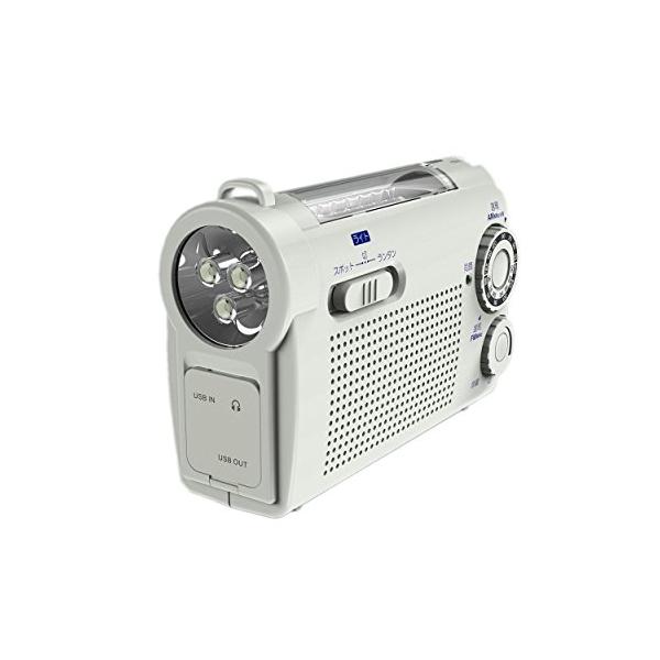 - ◆商品名:手回し充電AM/FMラジオライト KDR-107W本体サイズ:W135xD55xH95mm本体重量:約270g電源:内蔵充電池(Li-ion)手回し充電、USB充電対応/単3乾電池3本使用(別売)AM/FMラジオ(FMワイドバンド対応)3LEDライト、6LEDランタン搭載AM:530-1620KHz/FM1:76.0-90MHz/FM2:88-108MHzイヤホン端子搭載電源入力microUSB端子/電源出力USB端子microUSBケーブル+携帯電話充電用アダプタ付属(FOMA/Softbank・au)ストラップホール(ハンドストラップ付属)