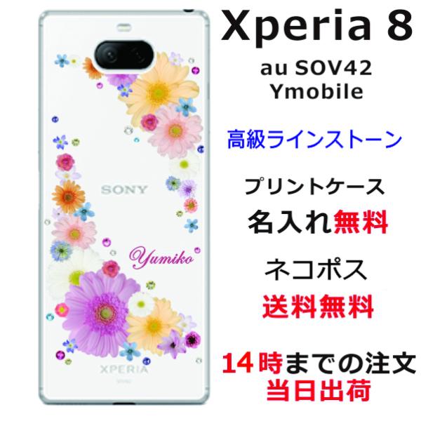 Xperia 8 ケース SOV42 エクスペリア8 カバー ラインストーン かわいい フラワー 花柄 らふら 名入れ 押し花風 ポップフラワー