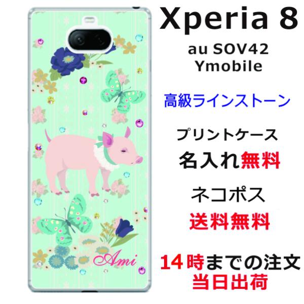 Xperia 8 ケース SOV42 エクスペリア8 カバー ラインストーン かわいい らふら 名入れ 豚 蝶