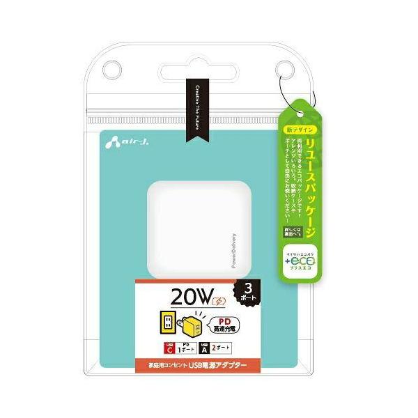 エアージェイ +ECO PD20W対応 (USB×2.Type-C×1) AC充電器 ホワイト(AKJ-E20WPD3 WH)