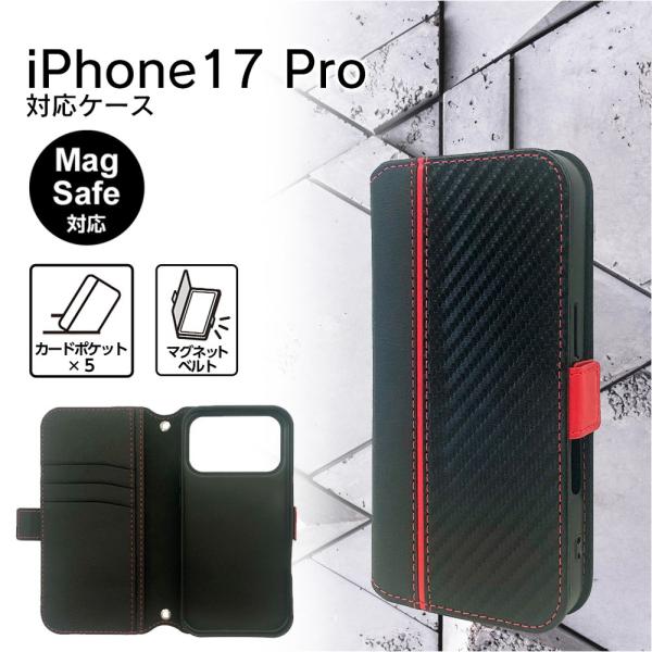 iphone17pro ケース ブラック Magsafe対応 手帳型 カード収納 サイドポケット ストラップホール マグネット 着脱しやすい ソフト