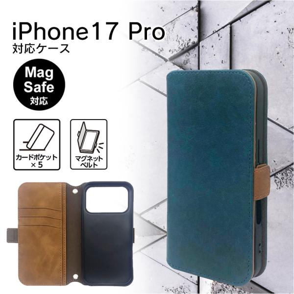 iphone17pro ケース ブルー Magsafe対応 手帳型 カード収納 サイドポケット ストラップホール マグネット